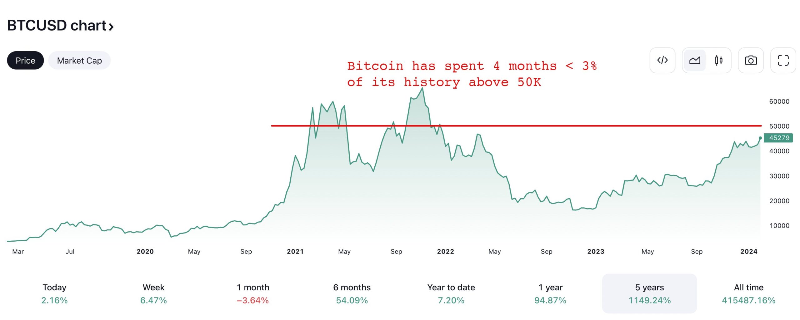 Zooming on the improvement within the month-to-month chart, the analyst notes that this value level sits at $50,000, a key psychological stage that bulls have failed to beat because the bull run from mid-November 2023.