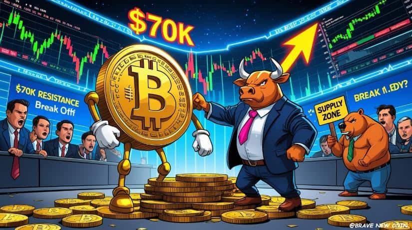 Current market information exhibits the Bitcoin price today climbing again towards $70,000 after discovering help close to the mid-$67,000 vary earlier within the week. The rebound has positioned the asset inside a big resistance hall between $69,000 and $71,000 that has repeatedly capped rallies since early February.