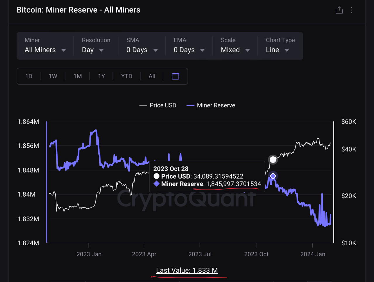 Earlier than this promoting began, the miner reserve had a worth of round 1,84,997 BTC. Following the decline that the indicator has witnessed since then, the miners now maintain about 1,833,222 BTC.