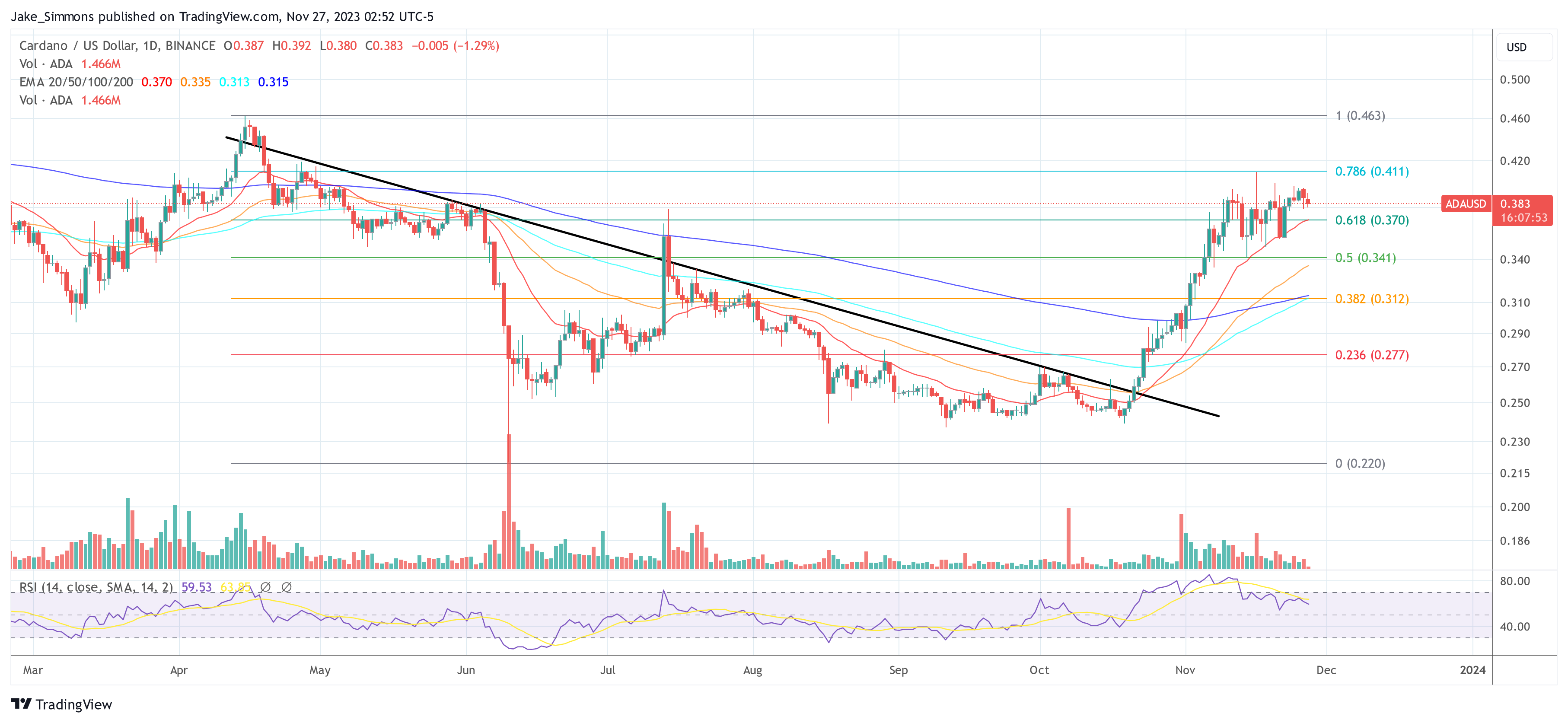 ADA has seen a powerful upward development since breaking out of the downward development (black line) on October 21, which has induced the worth to rise by over 60%. For the previous two weeks, nonetheless, the rally has come to a standstill. The worth is in a consolidation after the ADA was rejected on the 0.786 Fibonacci retracement stage at $0.411.