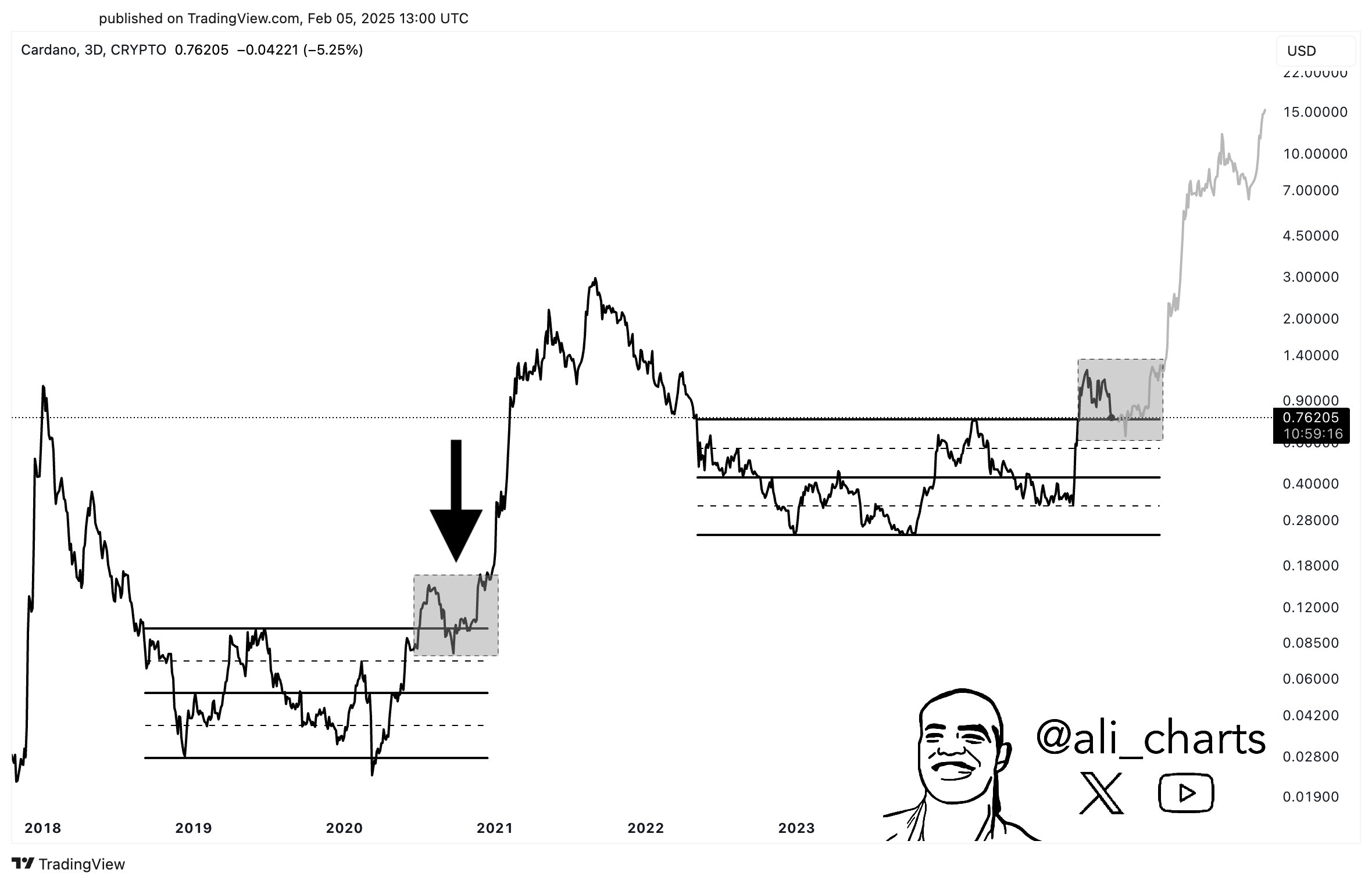 Martinez’s chart (revealed on the 3-day timeframe) attracts a parallel between Cardano’s value motion within the 2018–2021 cycle and its current construction, highlighting a near-identical fractal sample. Within the earlier cycle, ADA consolidated for a number of months inside an outlined horizontal vary earlier than staging a decisive breakout and retest of the higher boundary. That retest then led to a parabolic ascent spanning late 2020 into 2021.