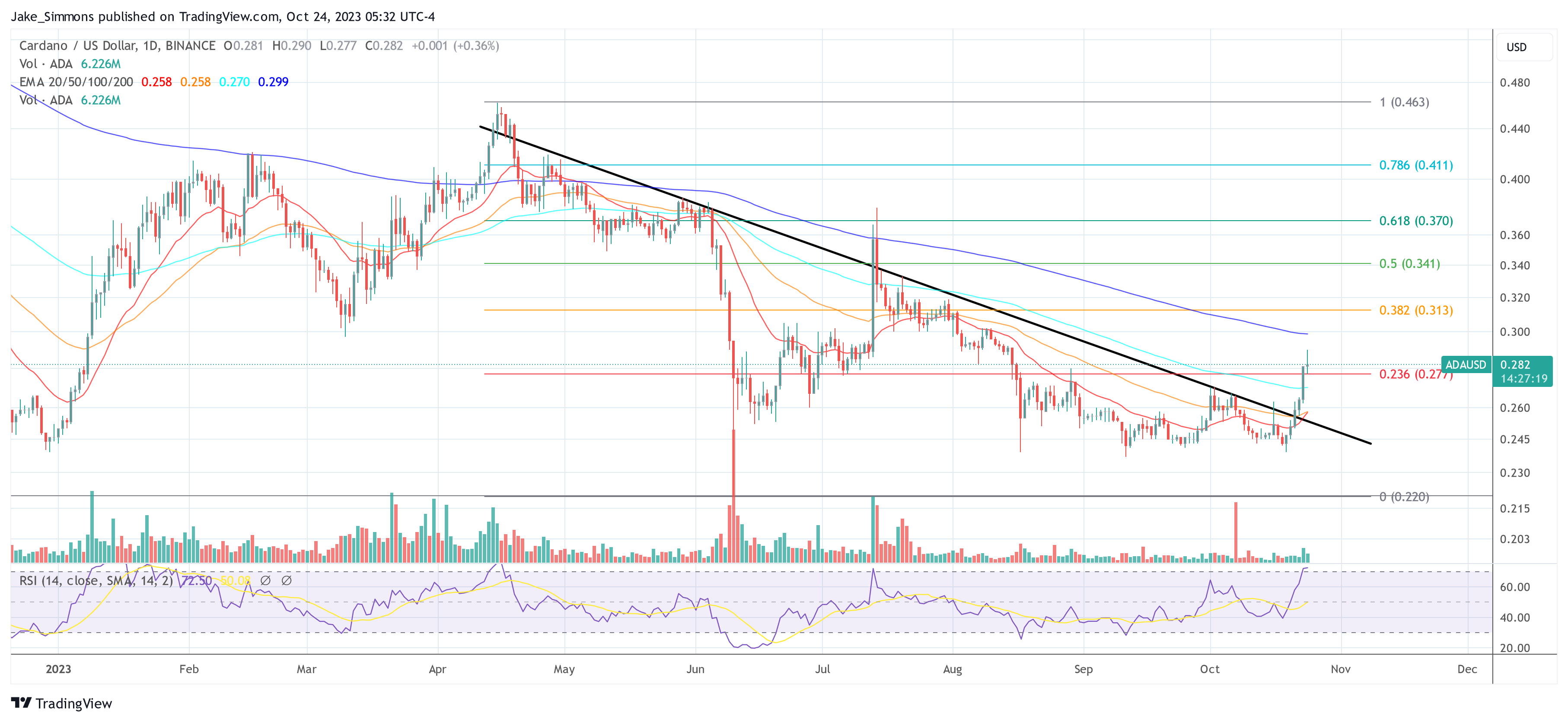 The Cardano worth has seen a robust uptrend up to now few hours, in keeping with the general crypto market. On the time of writing, ADA was buying and selling at $0.282, up 6.5% over the previous 24 hours. The 1-day chart of ADA exhibits that ADA was capable of escape of its 6-month downtrend (black line) this previous Sunday. On April 15, ADA marked its excessive for the 12 months at over $0.46, since then the Cardano worth has been on the decline.