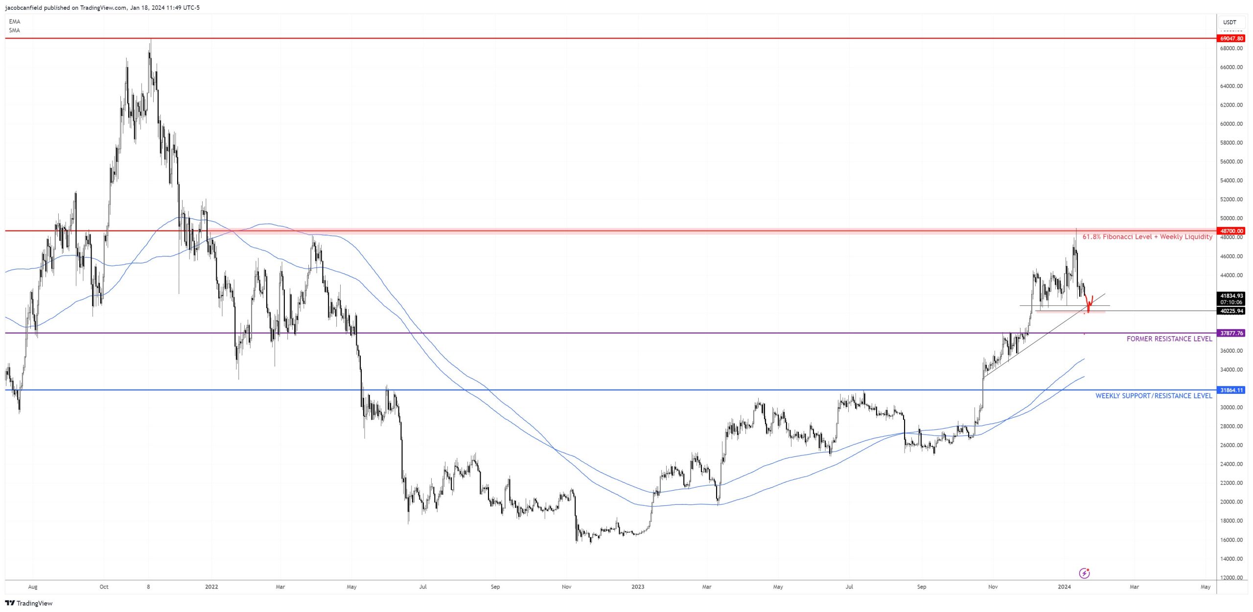 The Bitcoin worth skilled an extra sell-off yesterday and fell by greater than 5% intraday to as little as $40,660. For the reason that year-to-date excessive of $49,000 on January 11, the BTC worth has dropped by as a lot as 17%. Nonetheless, in response to famend crypto analyst Jacob Canfield, this might not be the top of the correction. In a latest analysis, Canfield warned that extra draw back may very well be on the playing cards within the short-term.