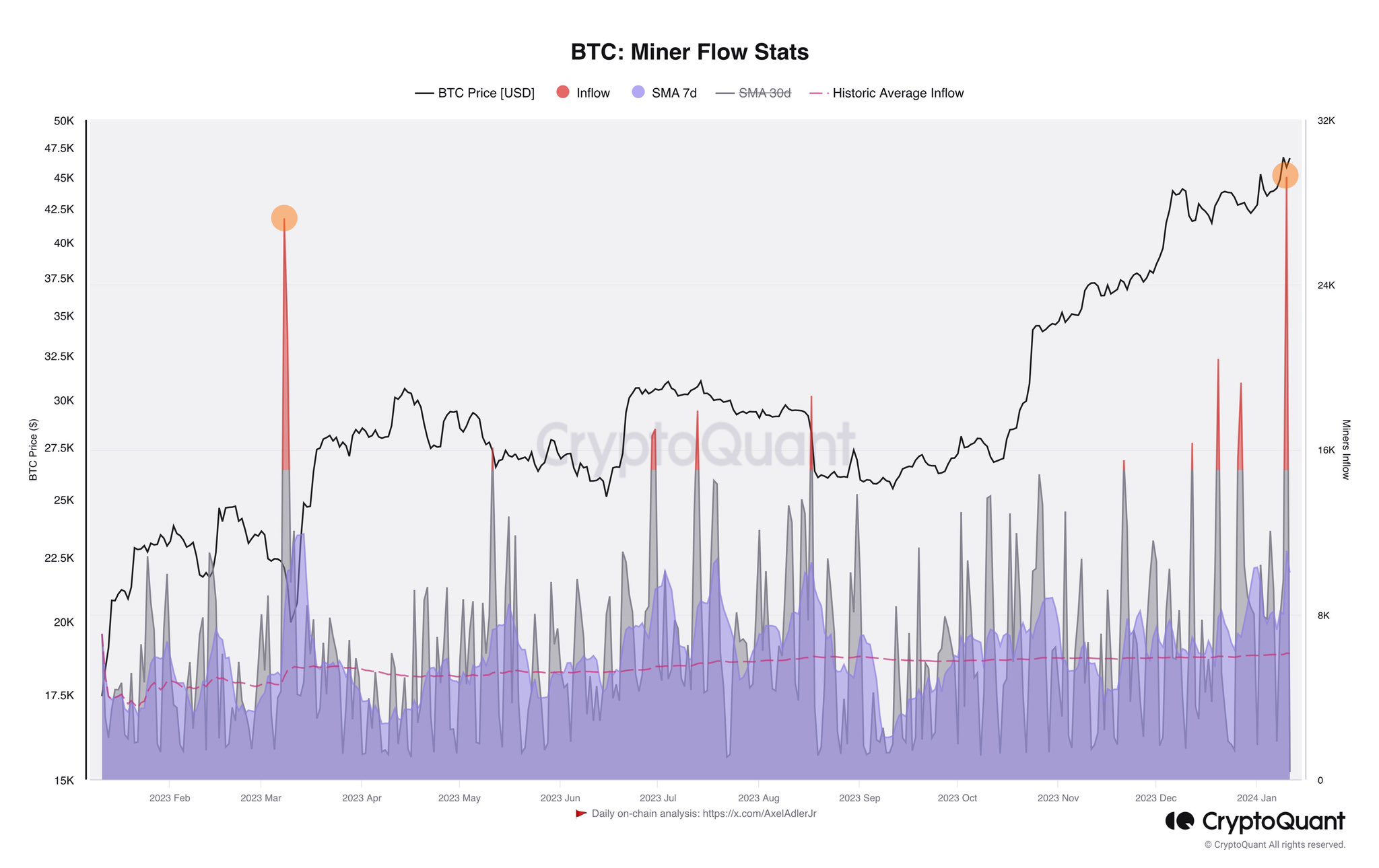 In the meantime, on-chain analyst Axel Adler Jr. could have found a motive for Bitcoin’s lagging efficiency to this point. He identified that “miners have determined to reap the benefits of the money influx into the market.”