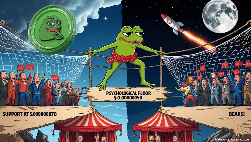Technical patterns on the Pepe Coin worth chart present PEPE approaching its 0.618 Fibonacci retracement degree at round $0.00000078, a zone broadly seen as a make-or-break assist. A drop under this degree may drag the crypto Pepe coin towards the psychological ground of $0.00000050, which might symbolize an additional 40% decline from present ranges.