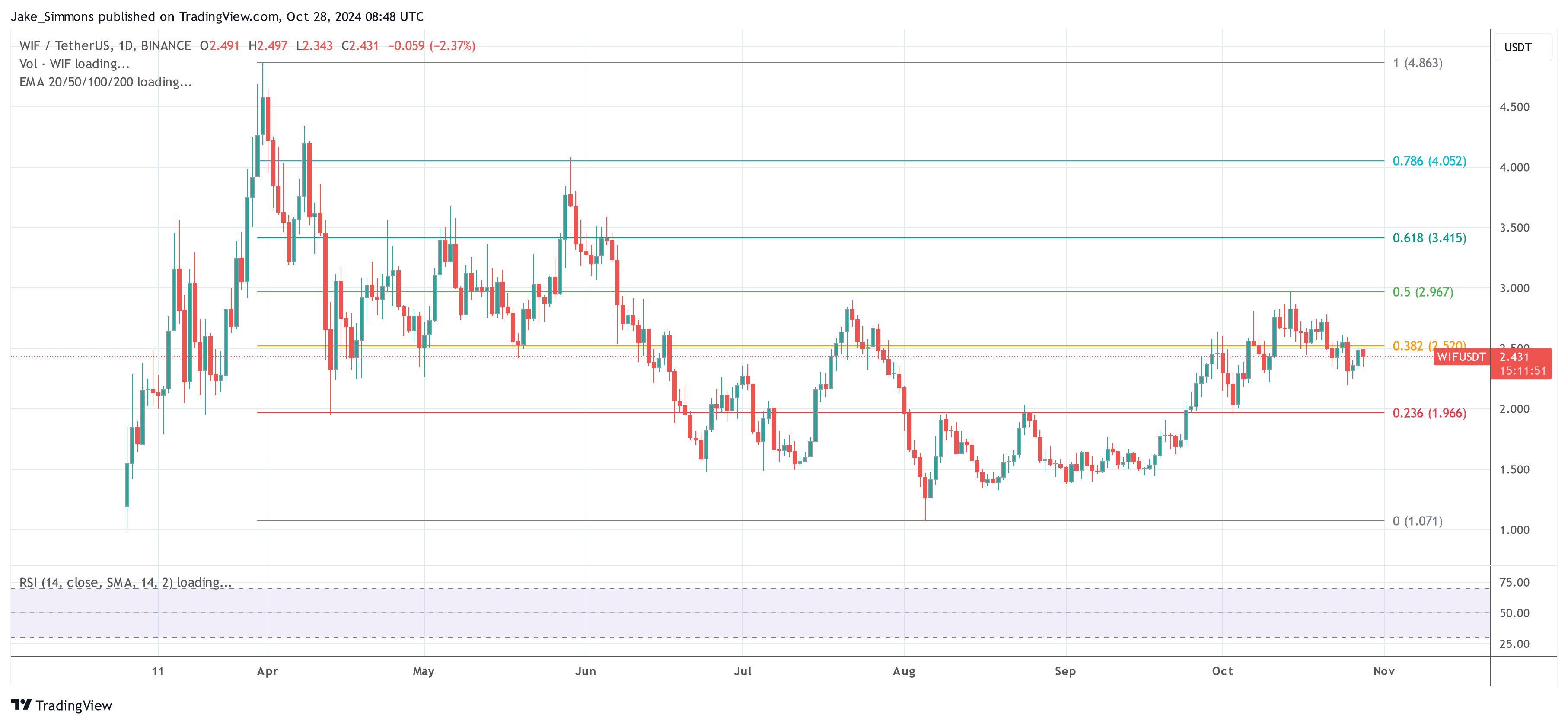 Within the meme coin sector, which Deutscher allocates a considerable 25% of his portfolio to, he recognized three major candidates: WIF, PEPE, and SPX. WIF, described because the main meme coin on the Solana blockchain by Deutscher: “It’s just about the primary Solana type of beta meme coin. Anons speak about it loads. It’s acquired main exchanges. Coinbase listings being teased coincidentally. It’s truly at a really good DCA Zone on the time of recording this video.”