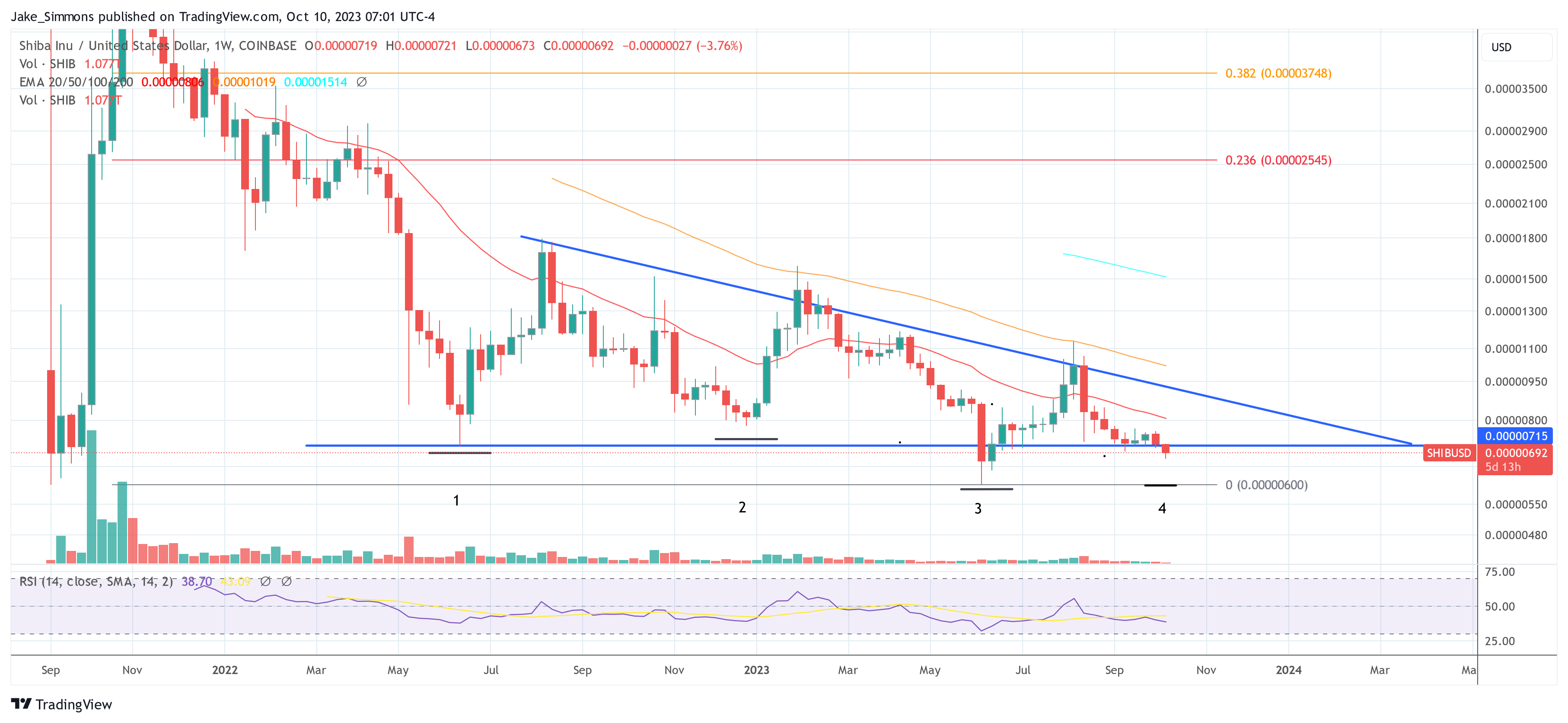 The 1-week chart reveals a compelling quadruple backside formation for SHIB. If this sample materializes, it may recommend a bullish surge of up to 250% from its breakout level, as delineated in prior assessments. Conversely, a starkly contrasting sample emerges within the type of a descending triangle, which has taken form over a span of 60 weeks. A conclusive break under its defining neckline may induce substantial declines in SHIB’s valuation.