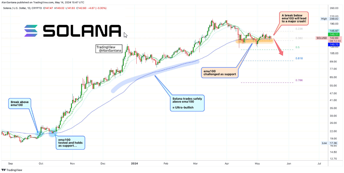 Crypto analyst Alan Santana emphasizes the importance of the Exponential Transferring Common 100 (EMA 100) as a important help degree for SOL. The EMA 100 acts as a technical indicator, reflecting the common worth over the previous 100 days.