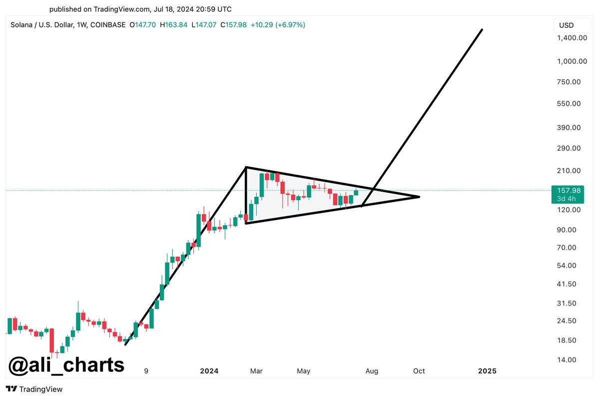 Based on Martinez’ evaluation, the value of Solana stands at $157.98 and thus just under the higher trendline of the channel. The consolidation has shaped inside a decent vary, with the higher and decrease boundaries clearly marked by development strains converging in direction of some extent on the chart projected to happen quickly. The crucial assist stage, as noticed from the consolidation part, is close to the $130 mark, with the resistance stage simply barely above the present worth, round $160.