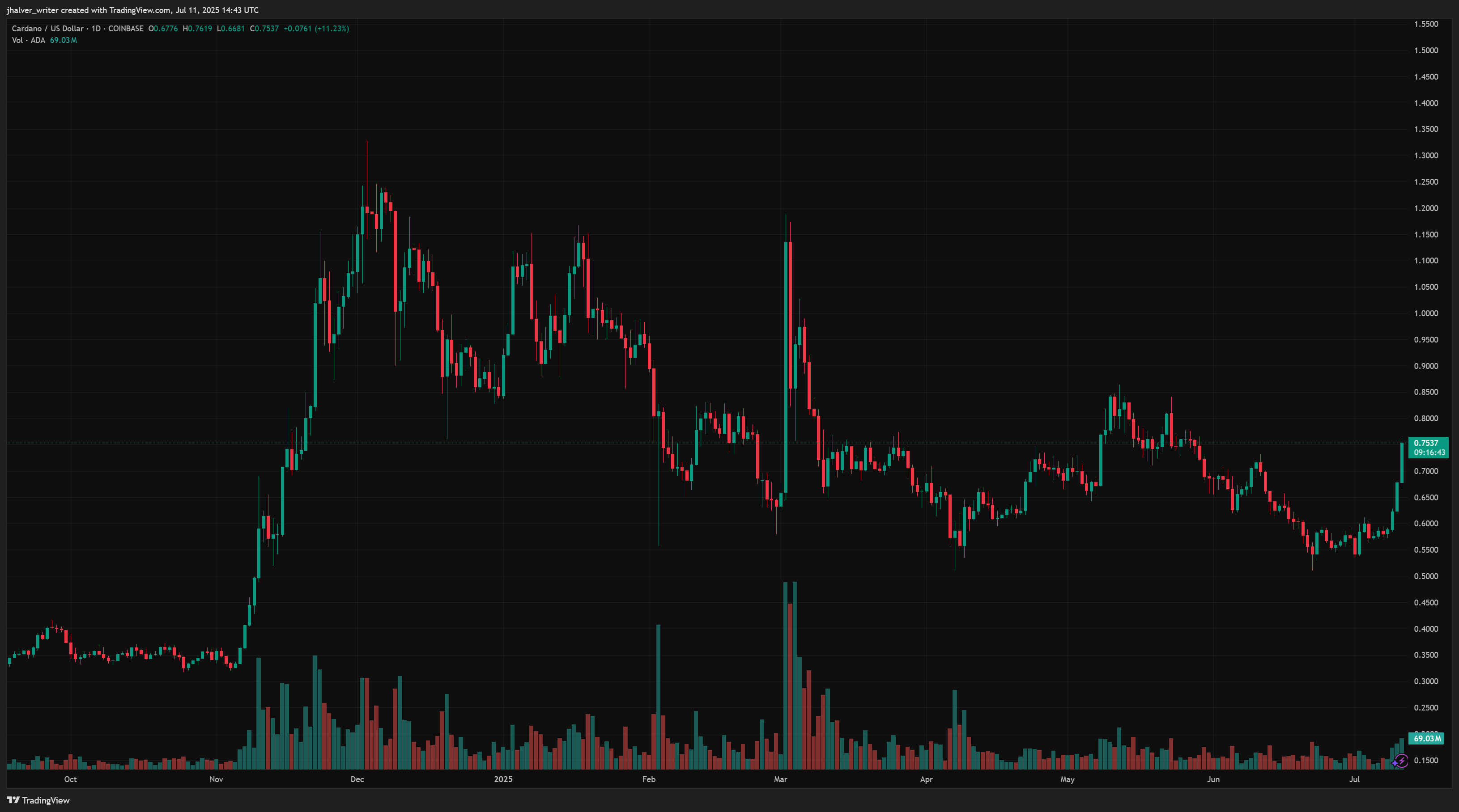 ADA's value tendencies to the upside on the day by day chart. Supply: ADAUSD on Tradingview