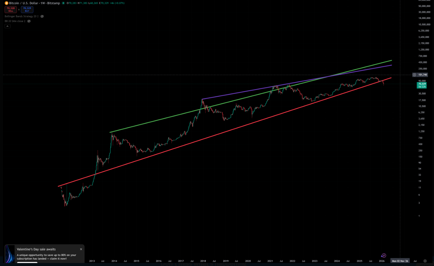Riley bases a part of his prediction on long-term trendlines. In keeping with him, Bitcoin’s worth has slipped under vital trendlines drawn over the previous decade.