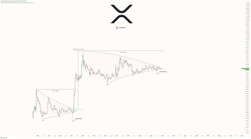 Sharing an in depth chart of XRP’s historical price movements, Marks famous that the cryptocurrency had shaped a definite triangle sample, beginning in 2014 and peaking in 2017. After breaking out of the triangle pattern in 2017, XRP skilled a dramatic worth surge, reaching new highs earlier than recording a brief dip after which rallying once more to its present all-time excessive of $3.84 in 2018.